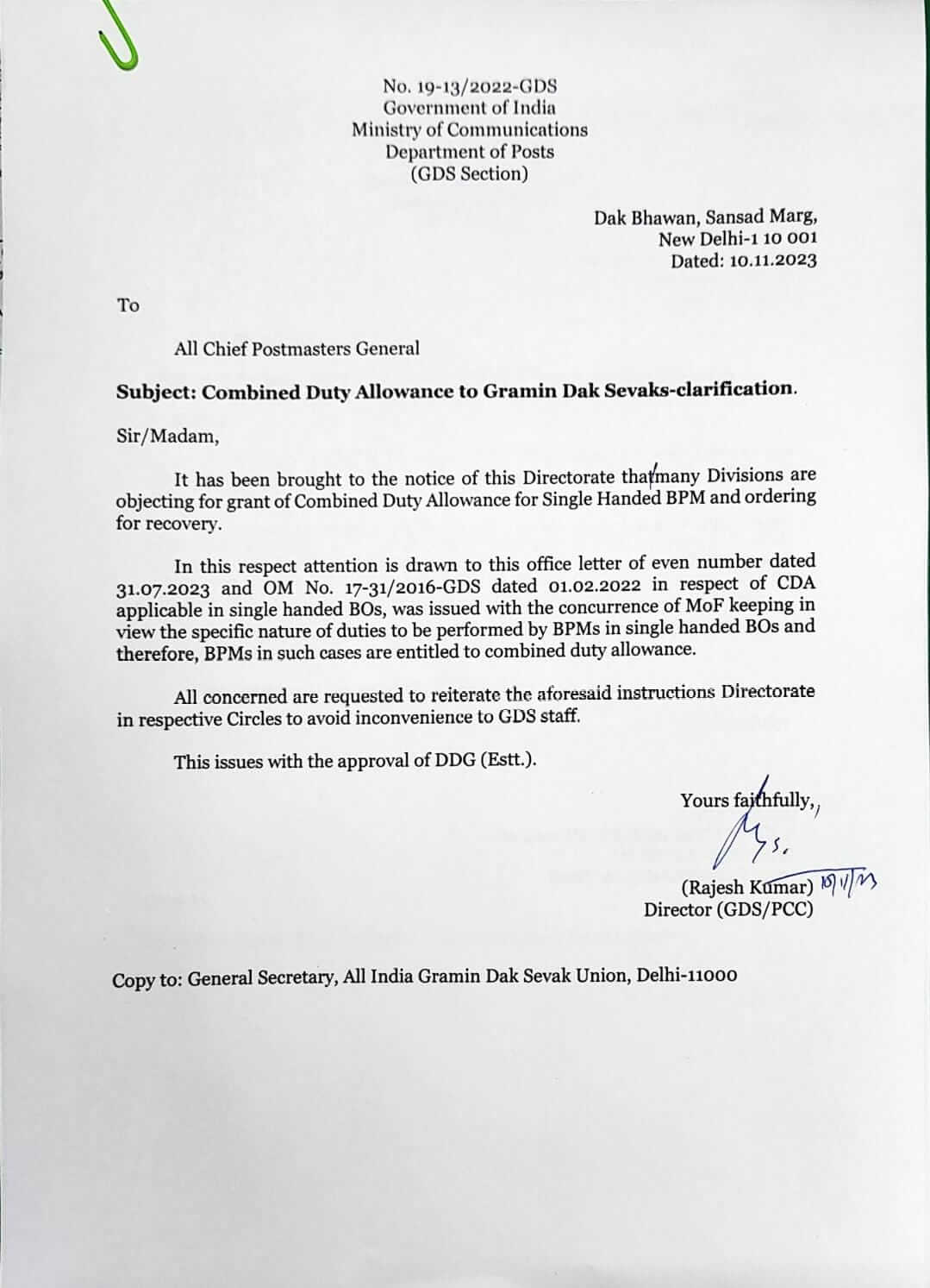 Combined Duty Allowance to Gramin Dak Sevaks